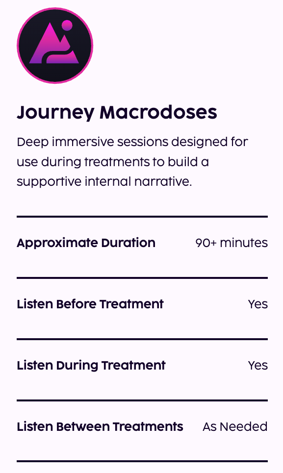 Journey Macrodoses are immersive guided audio experiences that act as a safe container to help you to slow down and go deeply within.